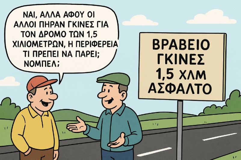 Τάκης: Καλά, ρε Γιάννη… Αν για 1,5 χιλιόμετρο δρόμο πήραμε «Γκίνες», τότε η Περιφέρεια που έστρωσε 7 χιλιόμετρα πρόσφατα τι πρέπει να πάρει; Νόμπελ;