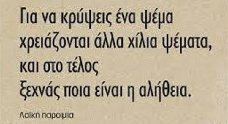 Ένας θρύλος του 19ου αιώνα λέει ότι η Αλήθεια και Το Ψέμα συναντήθηκαν κάποτε. Το Ψέμα καλημέρισε την Αλήθεια της είπε «Ωραία μέρα σήμερα». Η Αλήθεια για να βεβαιωθεί κοίταξε γύρω και τον ουρανό και όντως η μέρα ήταν ωραία.
