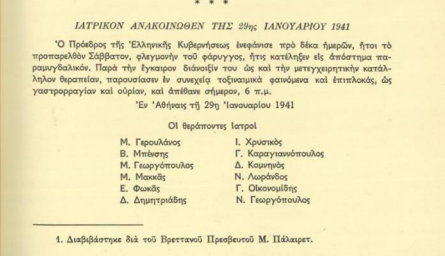 Στις 29 Ιανουαρίου 1941, ο Ιωάννης Μεταξάς, πρωθυπουργός της Ελλάδας και ηγετική μορφή της εποχής του Μεσοπολέμου, πέθανε ξαφνικά σε ηλικία 60 ετών. Σύμφωνα με το επίσημο ιατρικό ανακοινωθέν, η αιτία ήταν παραμυγδαλικό απόστημα που προήλθε από φλεγμονή του φάρυγγα. Παρά τις διάχυτες φήμες και θεωρίες συνωμοσίας, όπως υποψίες για ενδεχόμενη δολοφονία από βρετανικές υπηρεσίες, δεν υπάρχουν τεκμηριωμένα στοιχεία που να υποστηρίζουν κάτι τέτοιο.