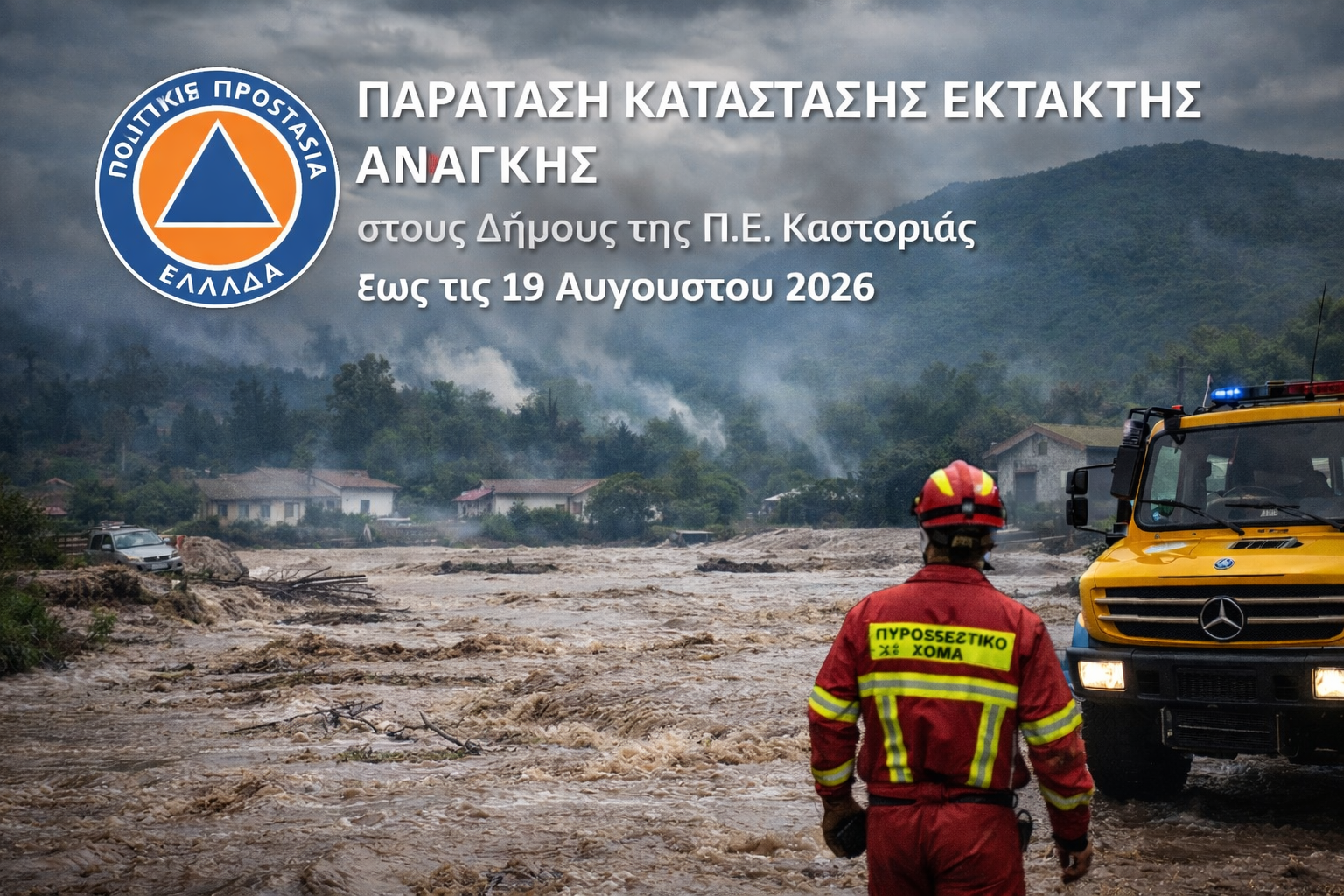 Παράταση της Κατάστασης Έκτακτης Ανάγκης στους Δήμους της Π.Ε. Καστοριάς έως τις 19 Αυγούστου 2026