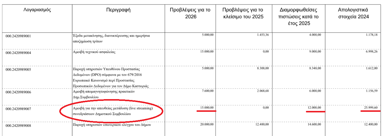 Στον σχετικό κωδικό «Αμοιβή live streaming Δημοτικού Συμβουλίου» βλέπουμε: