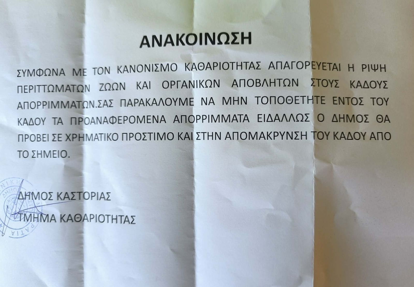 Το πιο ενδιαφέρον στοιχείο όμως δεν είναι η απαγόρευση. Είναι ότι το έγγραφο δεν έχει υπογραφή. Μόνο μια σφραγίδα: «Δήμος Καστοριάς – Τμήμα Καθαριότητας».