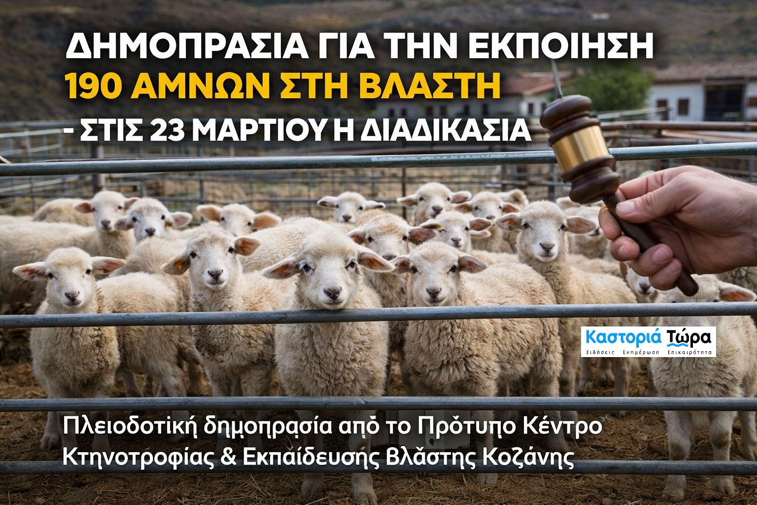Η διαδικασία θα πραγματοποιηθεί τη Δευτέρα 23 Μαρτίου 2026, από τις 11:00 έως τις 13:00, στη Βλάστη Κοζάνης, και αφορά τουλάχιστον 190 ζώα της φυλής «Φλωρίνης-Πελαγονίας», με μέσο ζών βάρος περίπου 8 κιλά.