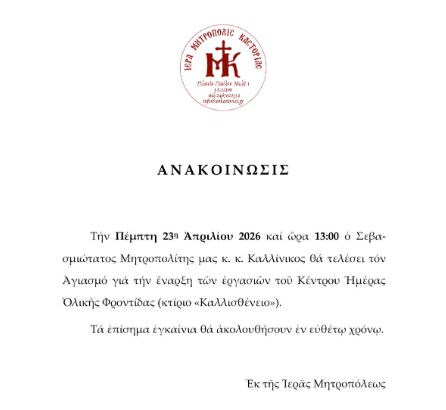 Σύμφωνα με την ανακοίνωση της Ιεράς Μητροπόλεως, την Πέμπτη 23 Απριλίου 2026 και ώρα 13:00, ο Σεβασμιώτατος Μητροπολίτης κ.κ. Καλλίνικος θα τελέσει τον Αγιασμό για την έναρξη των εργασιών στο κτίριο «Καλλισθένειο», όπου θα στεγαστεί το νέο Κέντρο.